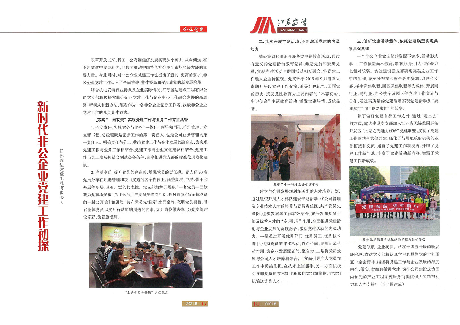 由江蘇省安裝行業協會主辦的《江蘇安裝》2021年第4期(總第207期)“企業黨建”專欄刊發我司文章《新時代非公企業黨建工作初探》。 ...