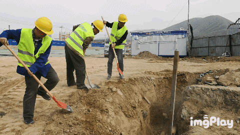 施工人員正在進(jìn)行室外線管預(yù)埋的土方回填工作