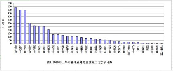 從各地查處的違法工程項目數量看,重慶、江蘇、四川3省(市)查處力度較大,分別查處項目535個、500個、496個(見圖1)。